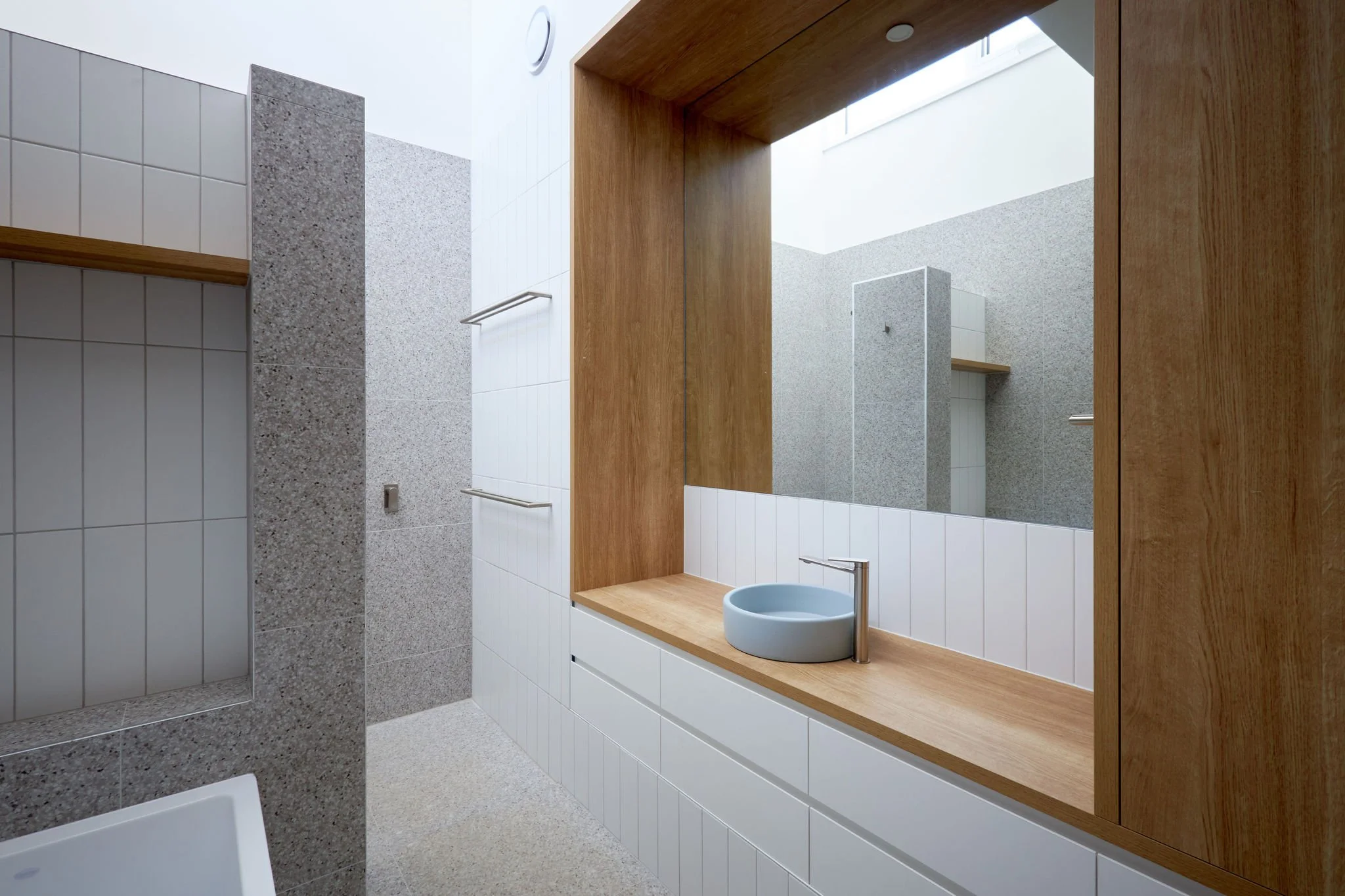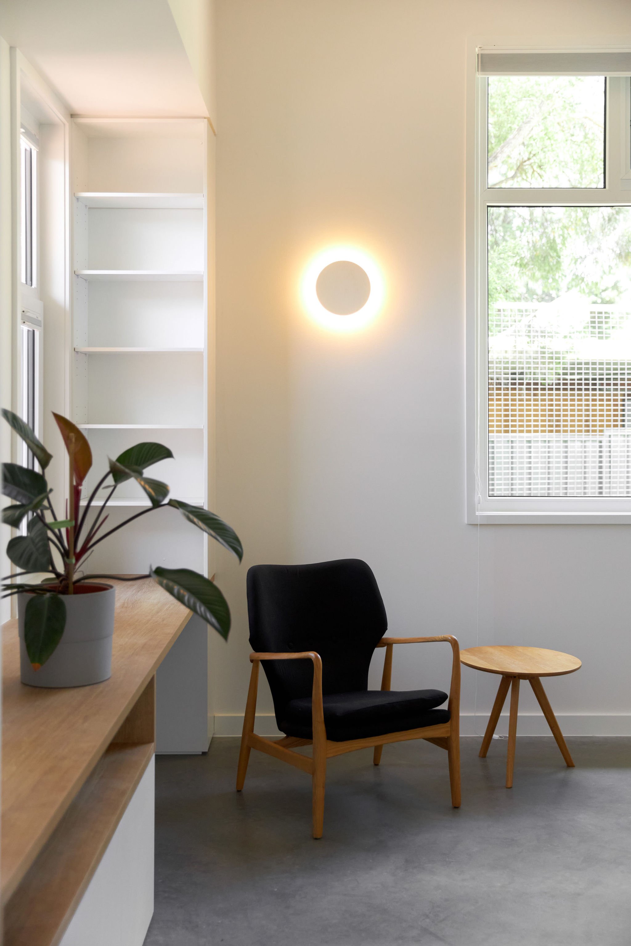 The new dwelling is a 4-bedroom, 2-bathroom, 193sqm home, with 45sqm garage. The new building has a low-lying form to create a humble street presence, surrounding by a long north-facing garden and deck. The split-level home navigates the slope of the site, with the roof pitch following suit. A raised ceiling over the kitchen, laundry and bathroom delivers variety of space and natural light to all areas. The entry of the home is tucked to the side to allow a kids bedroom wing, a master bedroom wing, and a central living space, all receiving north sun. A flexible multi-purpose space is also created to double as a fourth bedroom or second living space.